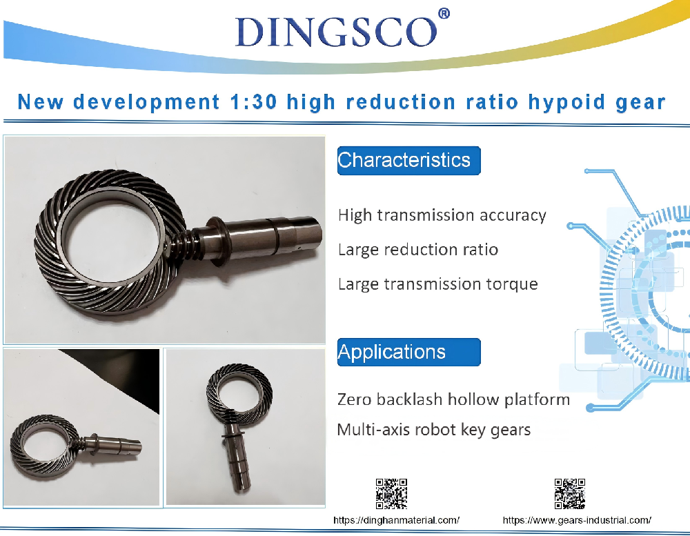 2025.10.16近日,DINGSCO 公司正式推出其新研发的传动比为 1:30 的准双曲面齿轮,这一产品的亮相标志着精密传动领域迎来重大突破。该齿轮拥有众多卓越的特性与优势。首先,其传动精度极高。依托先进的制造工艺与精准的设计,这款 齿轮能确保动力以极高的精度传输,这对于精密加工设备、先进机械臂等对运动控制精度要求严苛的设备